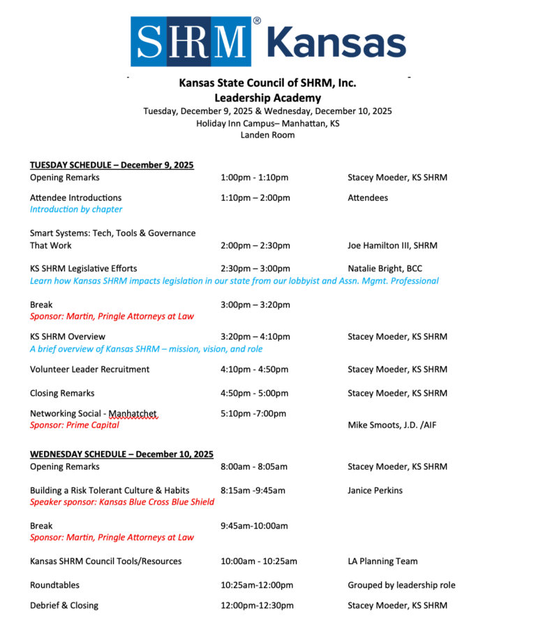 This training is for Volunteer Leaders Only – which includes Kansas Chapter Board and Committee Members, as well as Kansas SHRM State Council and Committee members. Training includes Leadership Development and Kansas SHRM Volunteer Leader Training for those participating in a 2026 volunteer role.